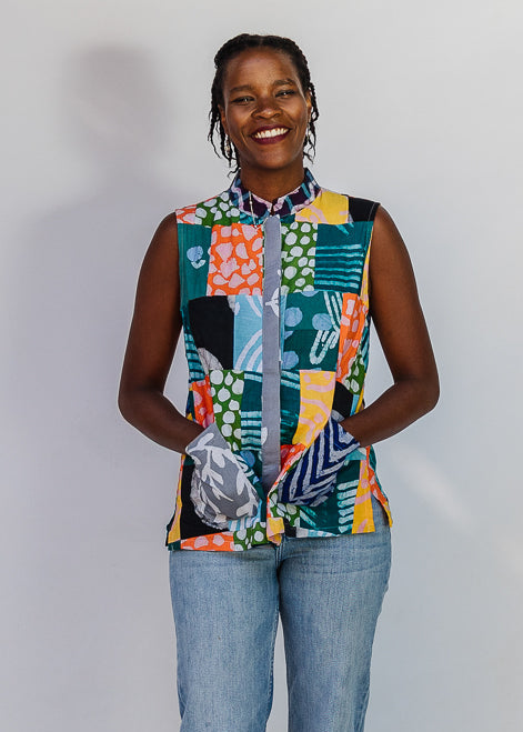 In order to create a batik fabric, recycled wax is melted and applied to the fabric using a stamped pattern. Edwina carves each stamped design herself in foam, which is easier to repurpose and work with than wood. Together with several women in Accra, Ghana, Edwina and her team always create designs that play on both pattern and layered color in a truly original way. Since we began working together in 2018, we've produced over 40 unique textiles together, keeping them in continuous production since we started. We're so honored to share this collaboration with Edwina and her team!