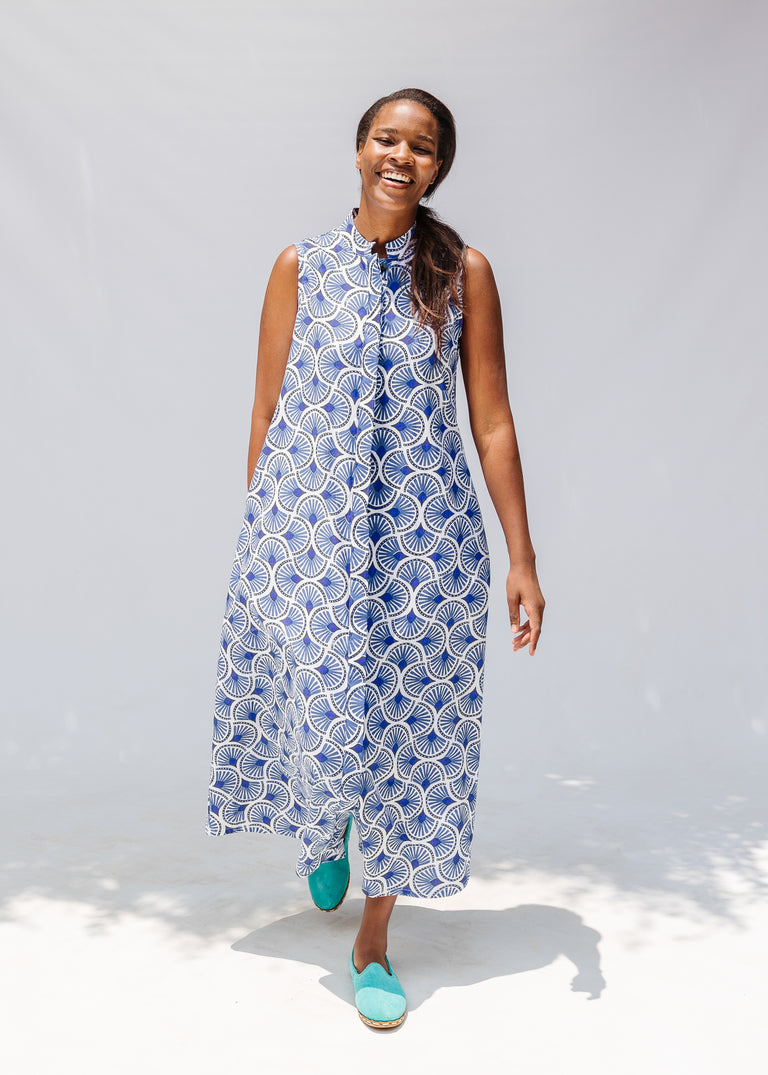 Erte All Day! This Maxi is a statement with its sweeping silhouette and geometric blue and white print that feels both timeless and modern. Perfect for long lunches or evenings out, this maxi shines when styled with colorful shoes for contrast, or layered with a cropped jacket for that extra edge.