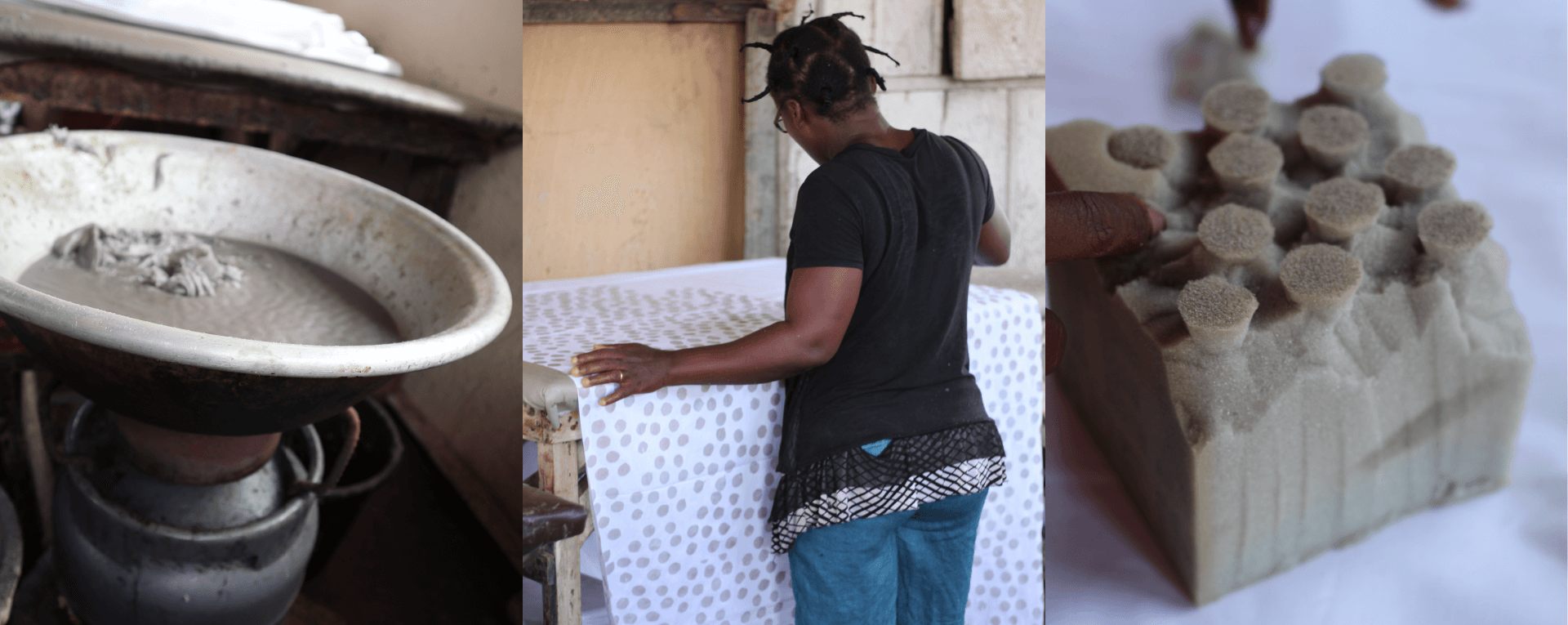 In order to create a batik fabric, recycled wax is melted and applied to the fabric using a stamped pattern. Edwina carves each stamped design herself in foam, which is easier to repurpose and work with than wood. Together with several women in Accra, Ghana, Edwina and her team always create designs that play on both pattern and layered color in a truly original way. Since we began working together in 2018, we've produced over 40 unique textiles together, keeping them in continuous production since we started. We're so honored to share this collaboration with Edwina and her team!