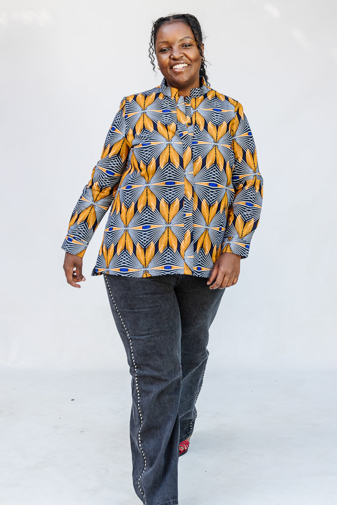 Peek a blue-tiful moment! This shirt is a playful twist on a classic pattern, blending bold golden fan motifs with deep blue geometry for a look that’s equal parts graphic and joyful.